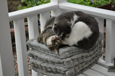 Igår kväll när det regnade hittade jag Gösta och Elvira uppkrupna på dynorna ute på farstukvisten, de verkade måttligt roade av vädret..Jag hämtade snabbt kameran, tyckte de såg så söta ut där de kurade ihop sig bredvid varandra! :)